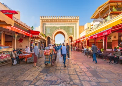 As the drifting and fresh breeze of morning strikes, we will be driving through atlas mountains until we reach the Volubilis ruins, remains of the Roman empire .then we will make a quick stop at Meknes the capital of the first ruling Arabic dynasty in Morocco, it dates back to 823, you can admire the enormous gateway that adorned with traditional Moroccan sculpture when the sky gets darker we will be found in Fez checking in to our hotel.
