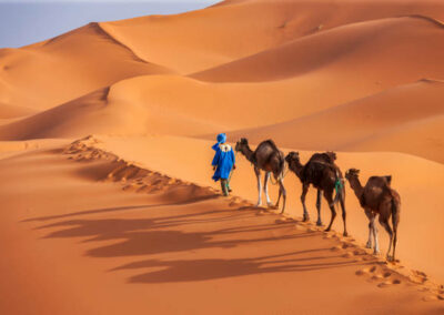 Enough with the past and the sun, now we leave towards the Switzerland of morocco “Ifrane”. On our way you will catch a glimpse of middle and high atlas mountains , then we make a short stop in a small Berber village “Azrou” to see the well known cedar forest and its apes , monkeys too ! by this time you’ll feel hungry so our lunch will be served in a glamorous restaurant in Midelt , our journey continues by driving through the mesmerizing “Tizi n talghamt “ mountain pass , beauty is still there to be discovered with the fascinating ziz gorges formed with volcanic rocks in the ziz valley , we will continue driving to the well charming Berber village Erfoud and Rissani until we arrive to Merzouga , where we will be riding camels for almost an hour to have an unforgettable nomad experience , we are going to sleep in a camp located in the heart of Sahara , with sand dunes and stars in the sky and dinner of course sounds like a lovely night doesn’t it ?
